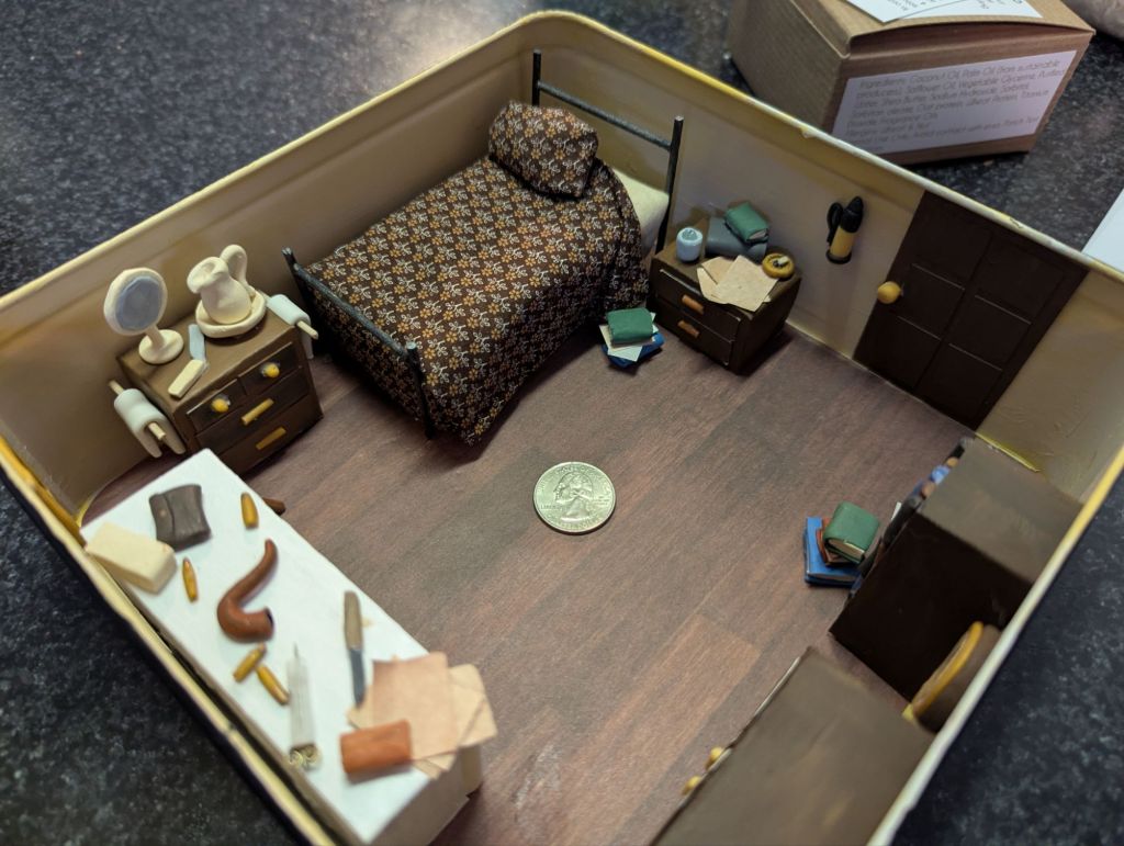 Holmes’s bedroom. Some items are clues, others are just furniture. Sent to a follower on Bluesky. #sherlockholmes #literature #mysteries #miniatures #art #specialinterest