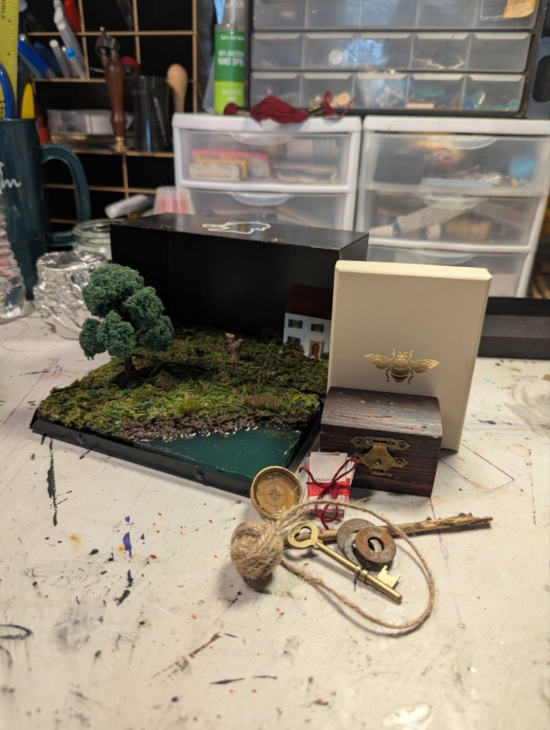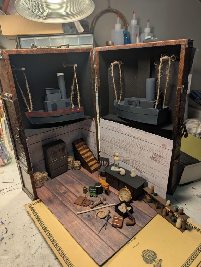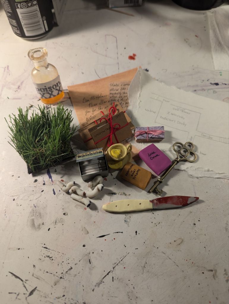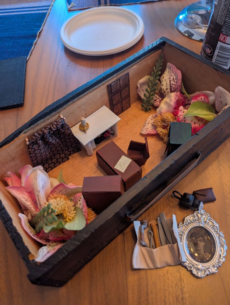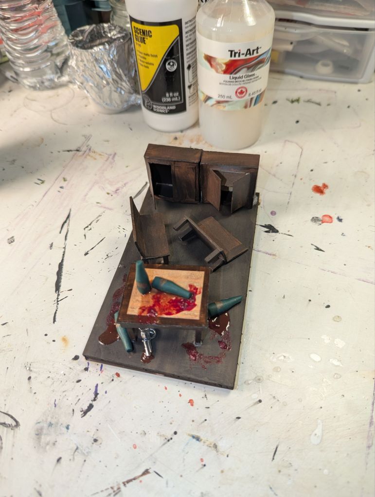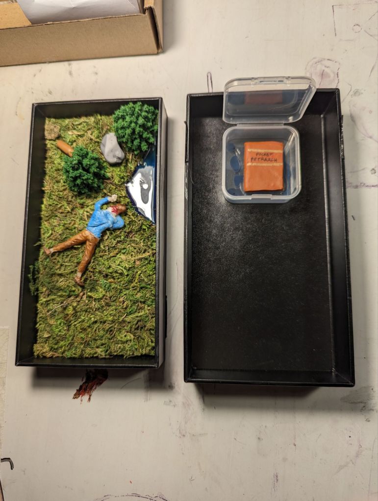 After finishing Joe’s box, in which I made an initial foray into making furniture and designing complete scenes, I’m afraid these boxes are going to get way more complex. This is my imagined, miniaturized version of the murder scene in this very fun story.