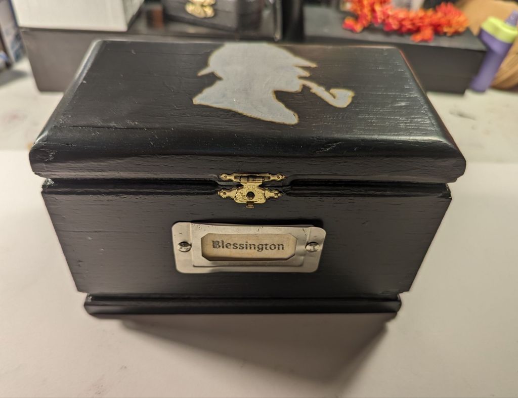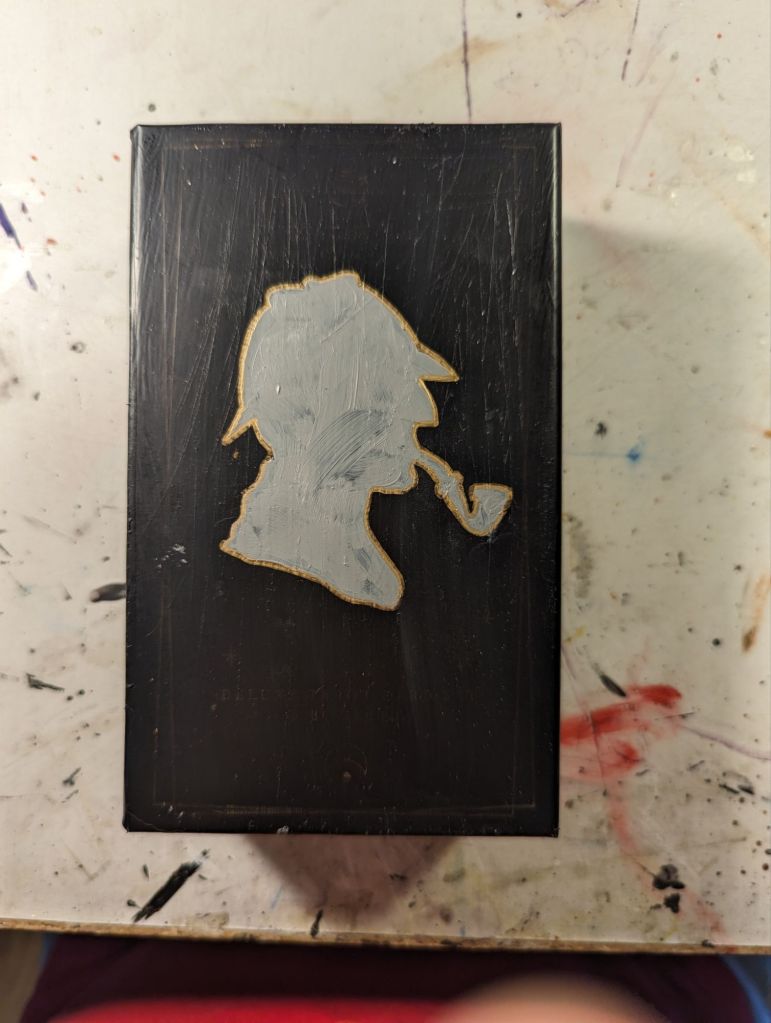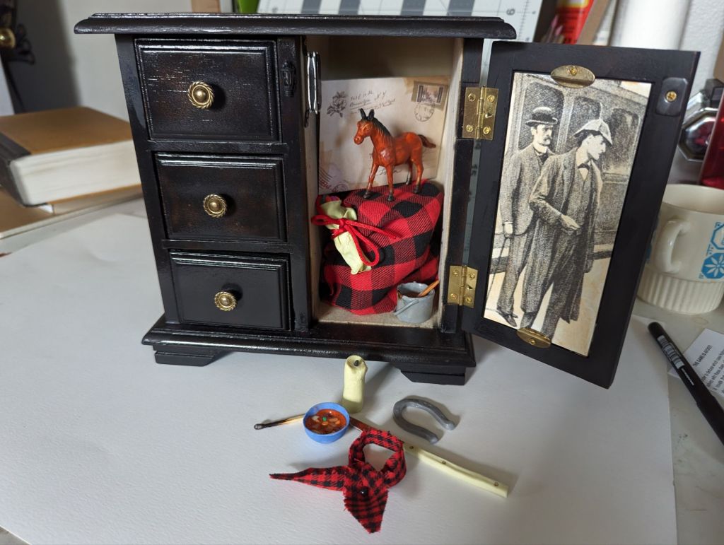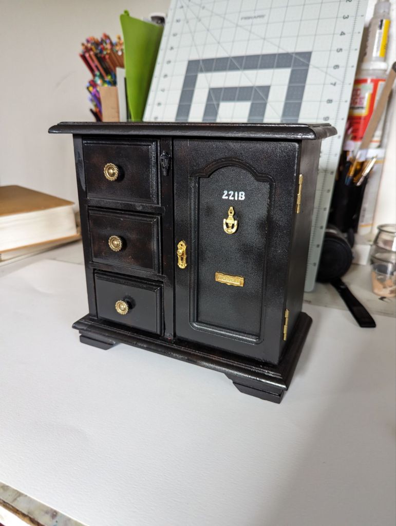 Gifted to my therapist’s office. I wanted to do something special for one of my favorite Holmes stories, so I modified this junk store jewelry box. Now it’s 221-B, Baker Street.