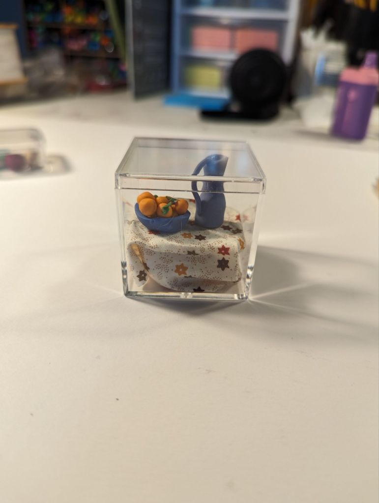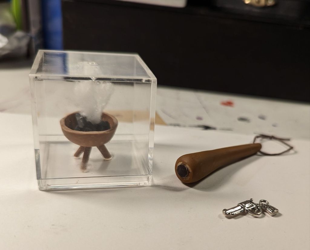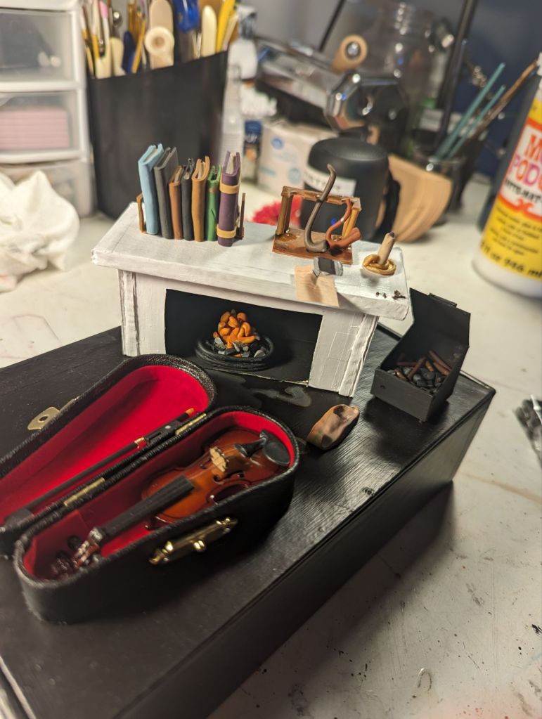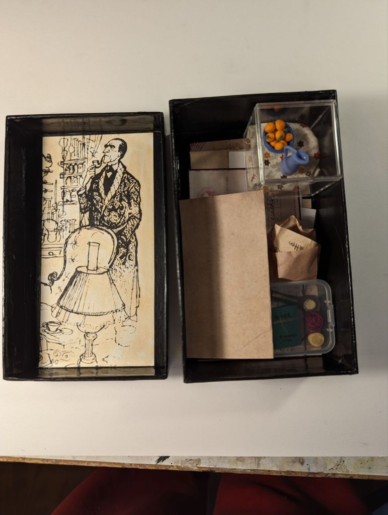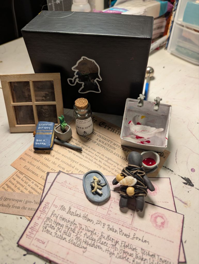 This is a work-in-progress for my violin instructor, Joe (hence the miniature violin, which I definitely bought because my polymer clay skills are not that polished yet.) Rather than basing this box on one specific story, I have instead decided to do a general Homes theme. I’m having a lot of fun with this one. The fireplace will be set against a wall with “V.R.” blown through with bullet holes, and I really want to throw my badass old hypodermic syringe in there, too, but my husband says I should probably work with Joe for a year or more before I get that weird.