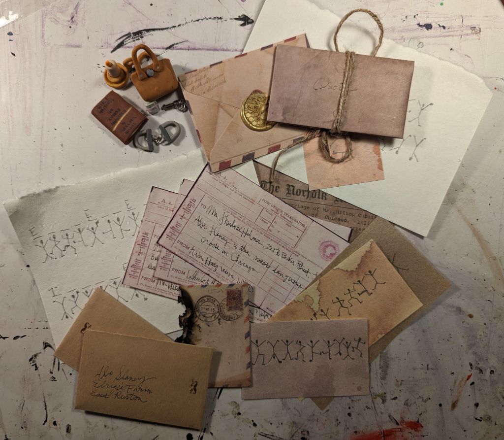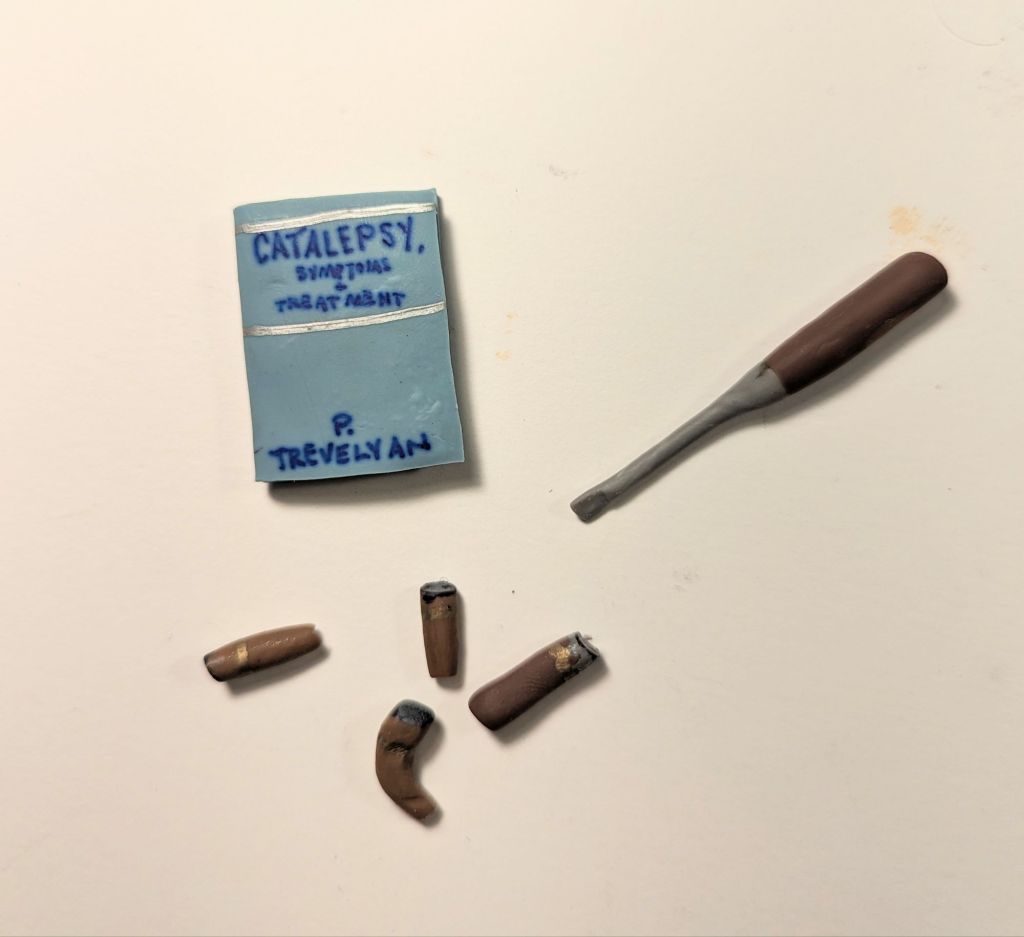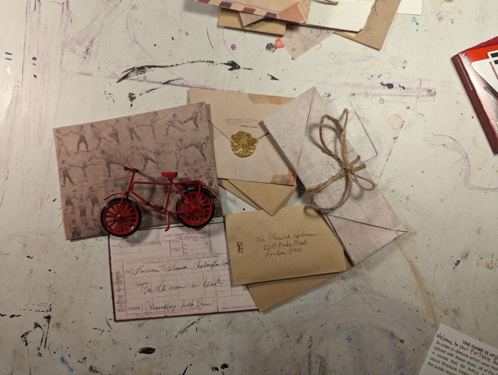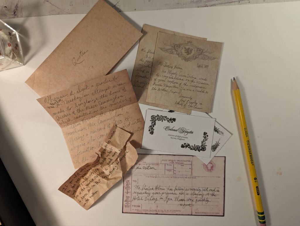 Holy moly – so many paper clues! Clay clues include a handbag with a bundle of money, a candle, handcuffs, and Holmes’s monograph on ciphers.
