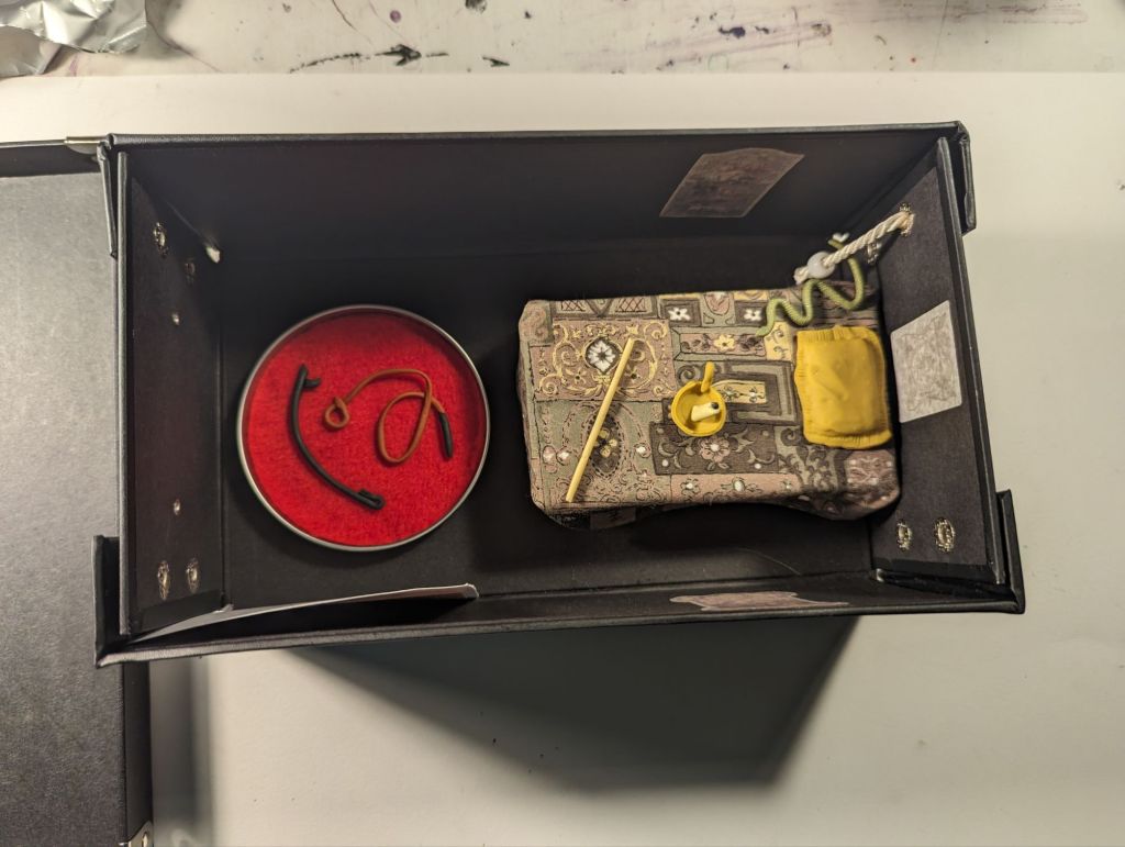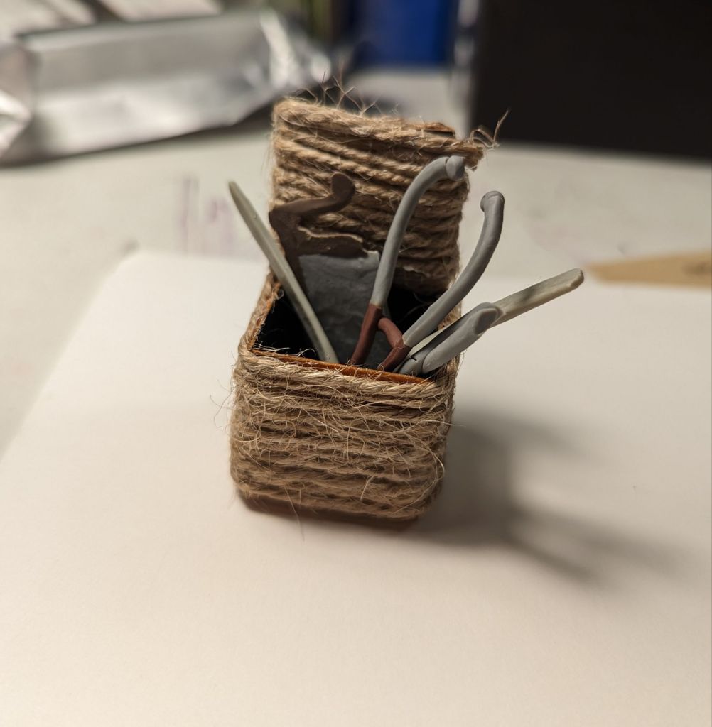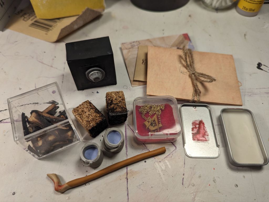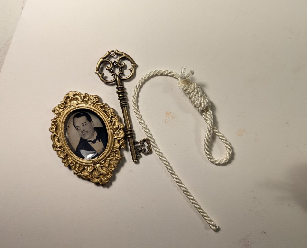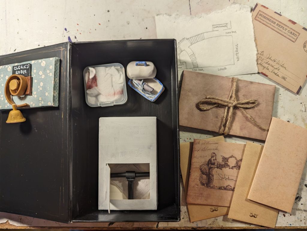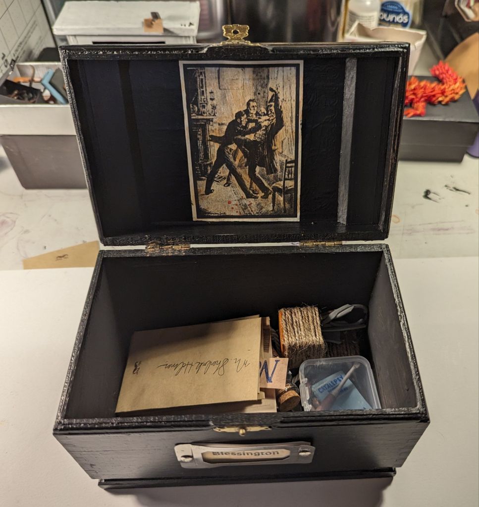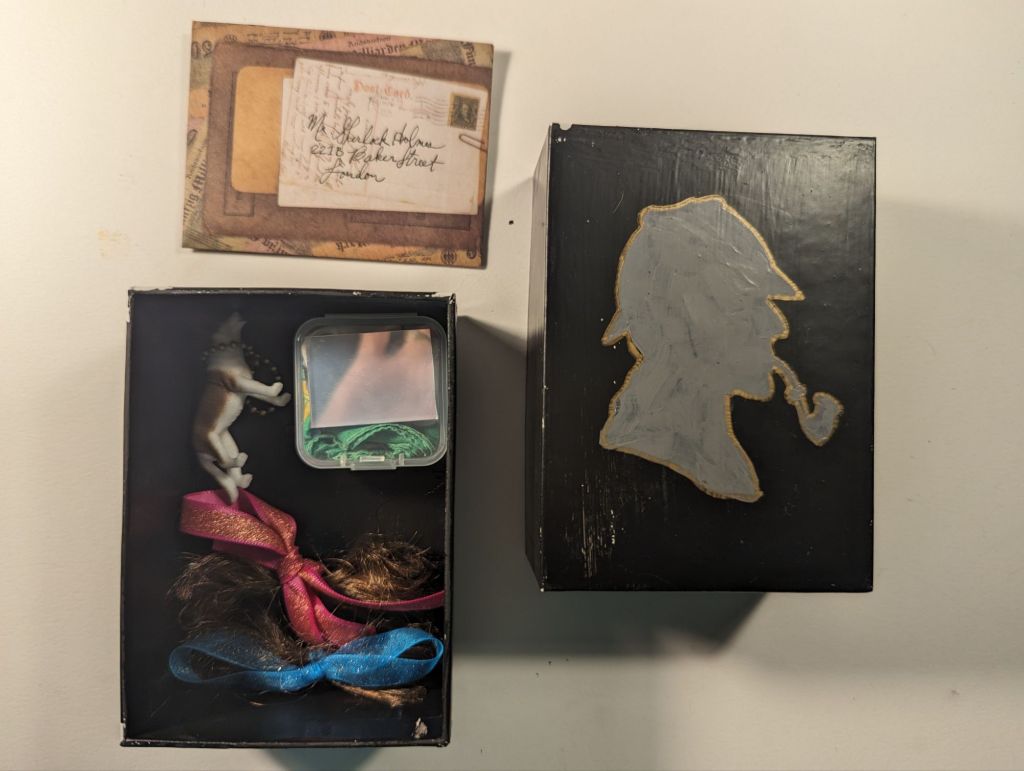 (Sent to the cast of the “Sherlock & Co.” podcast – Edit: They never bothered to acknowledge it, so it could still be in a shipping container somewhere in the Atlantic, for all I know. Trying really hard not to think the cast are enormous twats). This story comes in a wooden cigar box as a simulacrum for the black trunk which the murder victim kept at the foot of his bed. Clues include: four cigar butts, a noose, a scratched key, a framed photo, a screwdriver, a wicker basket of Victorian medical implements (super fun to make, btw. I mean, a bone saw!), and more.