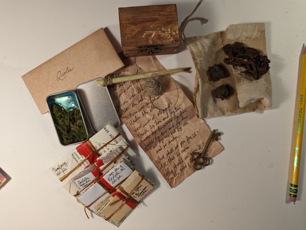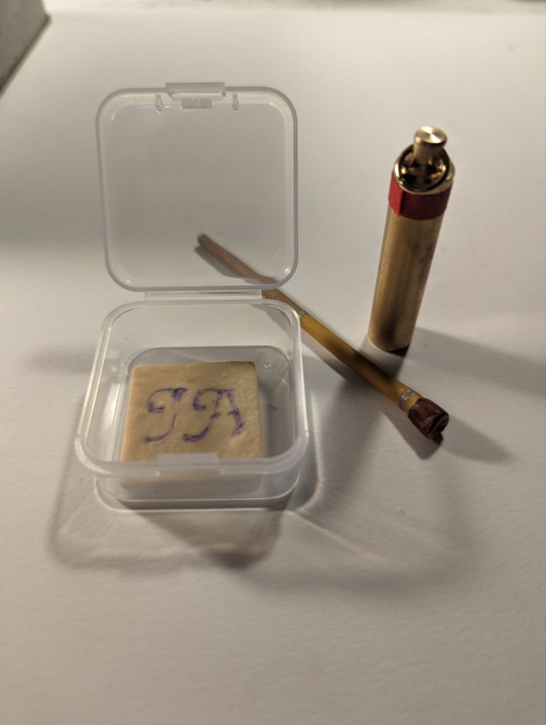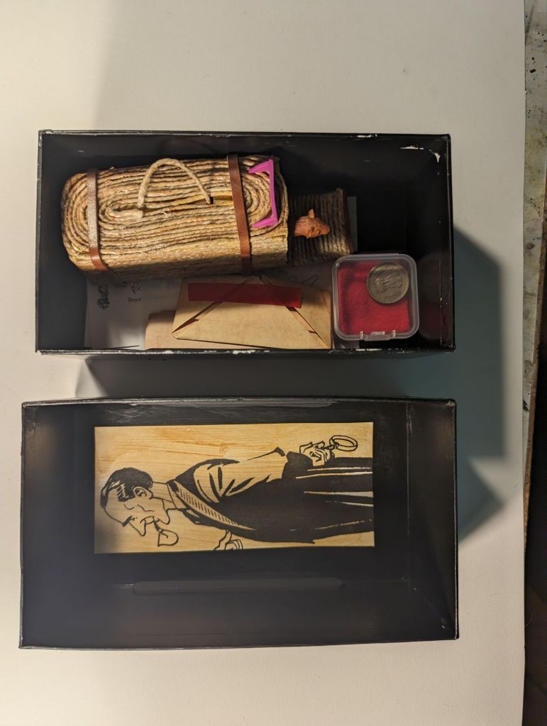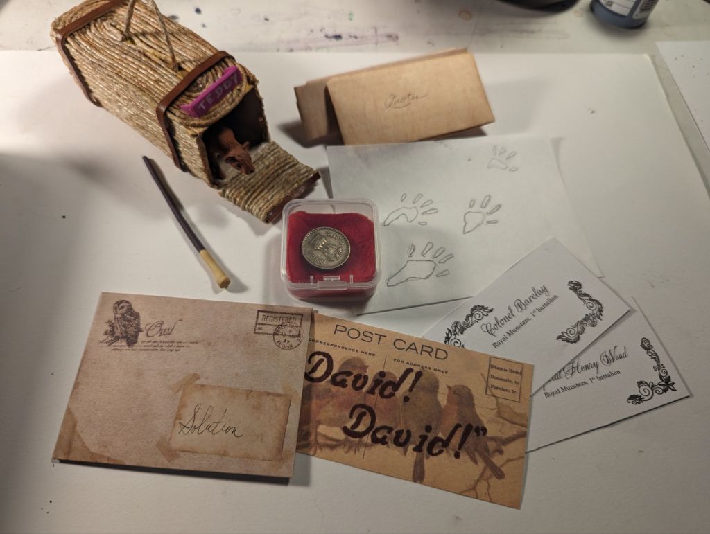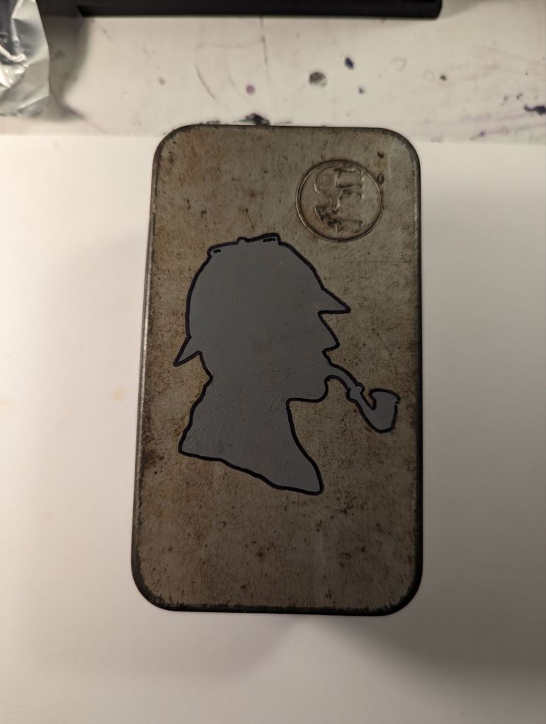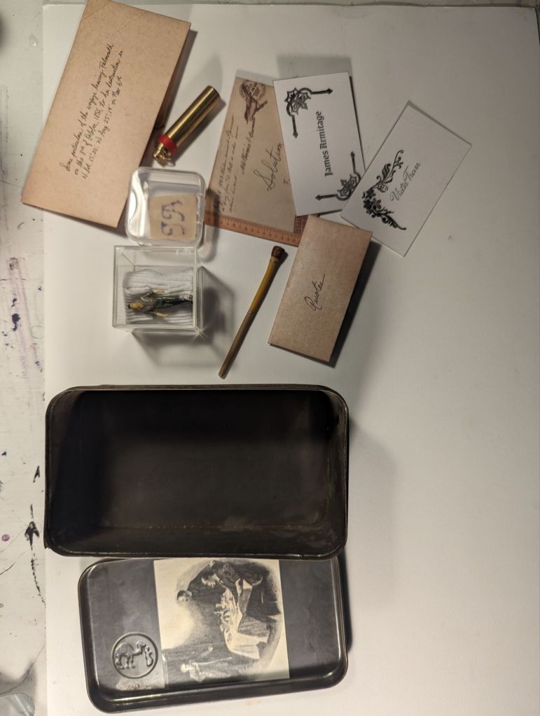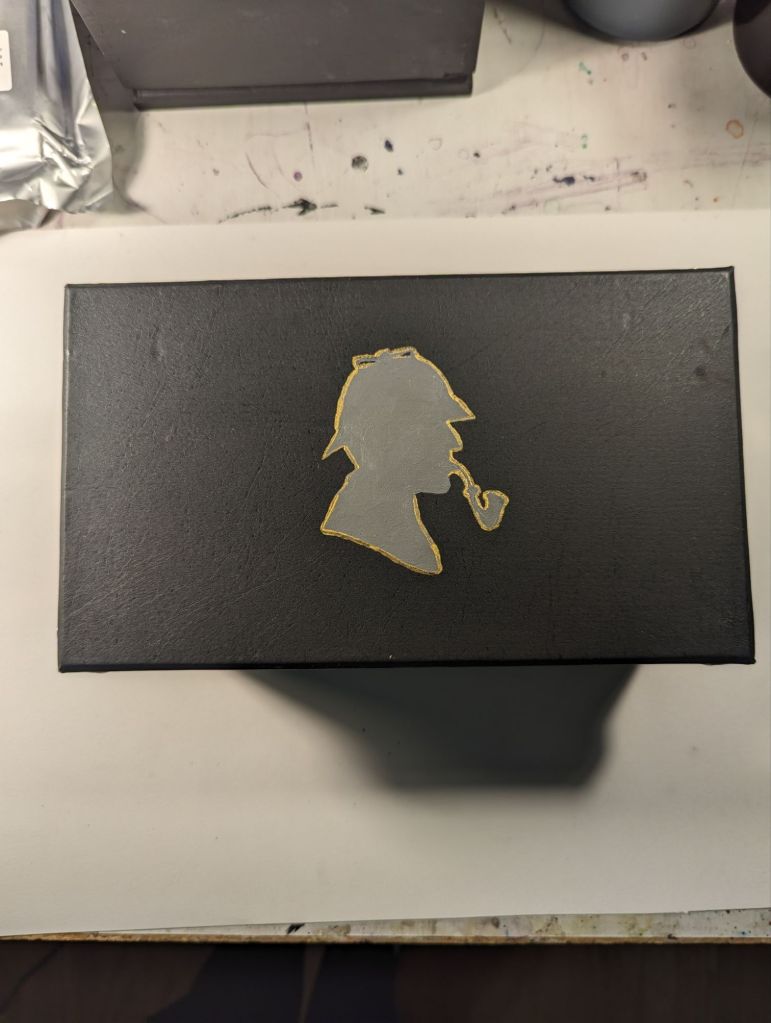 The story begins with Holmes handing Watson some items he extracts from a tin trunk full of old case files, so I put the clues inside this old tin box. It’s the only one I haven’t painted black.