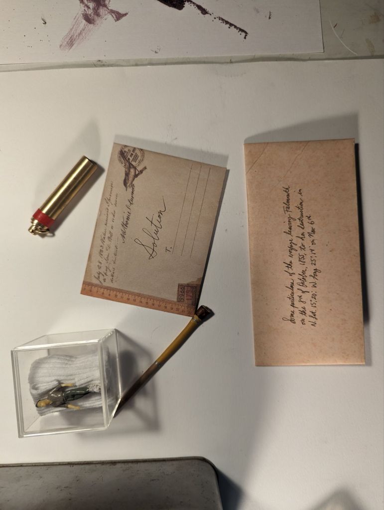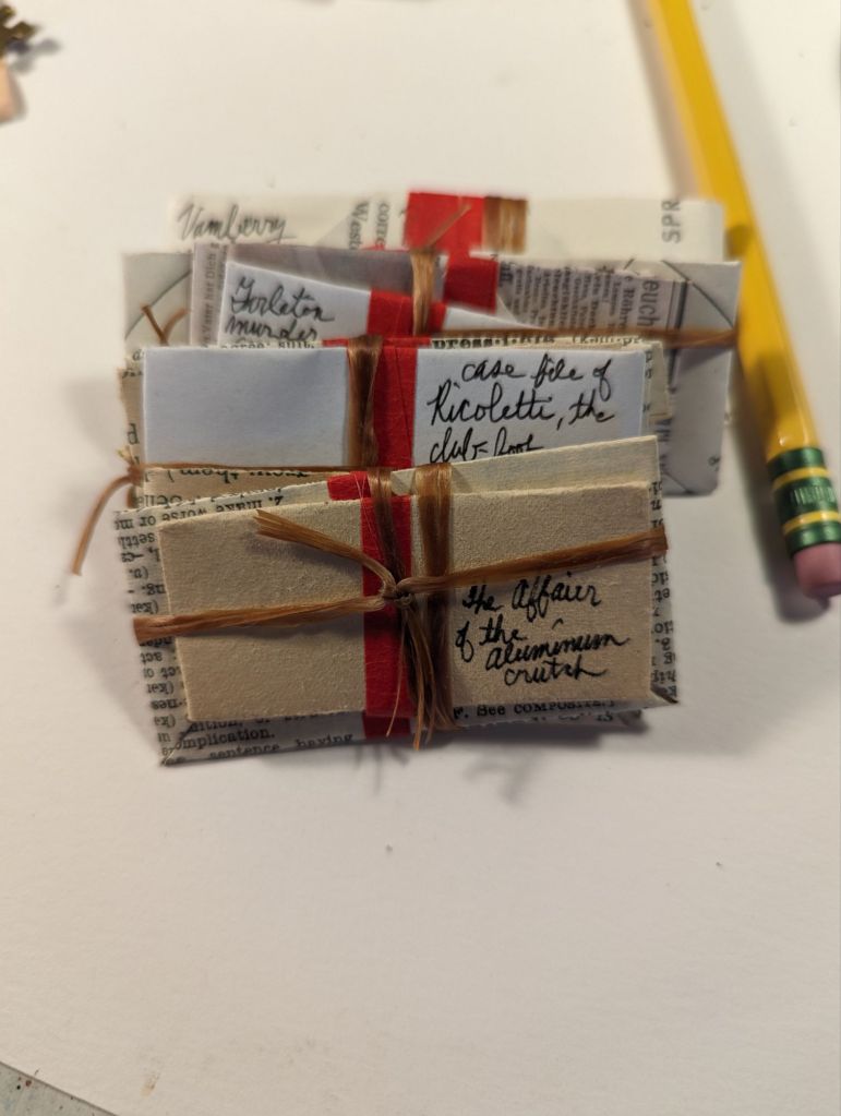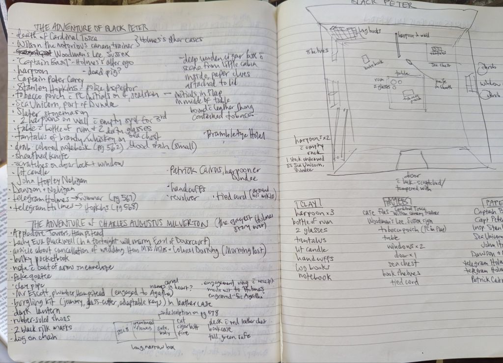 Here are some of my notes for “The Adventure of Black Peter” and “The Adventure of Charles Augustus Milverton.” After making the parlor scene of 221-B for Joe, my imagination and possibilities have expanded; now I’m envisioning recreating an entire scene from the story, with the extra clues stowed in a little plastic box affixed to the lid as I’ve done in the past. These are the most ambitious boxes I’ve ever attempted, and I’m so excited to start and have so many ideas blossoming inside my head that I’m gonna have to be careful not to precipitate a hypomanic episode.