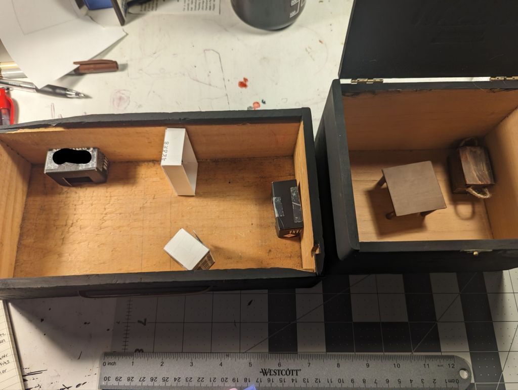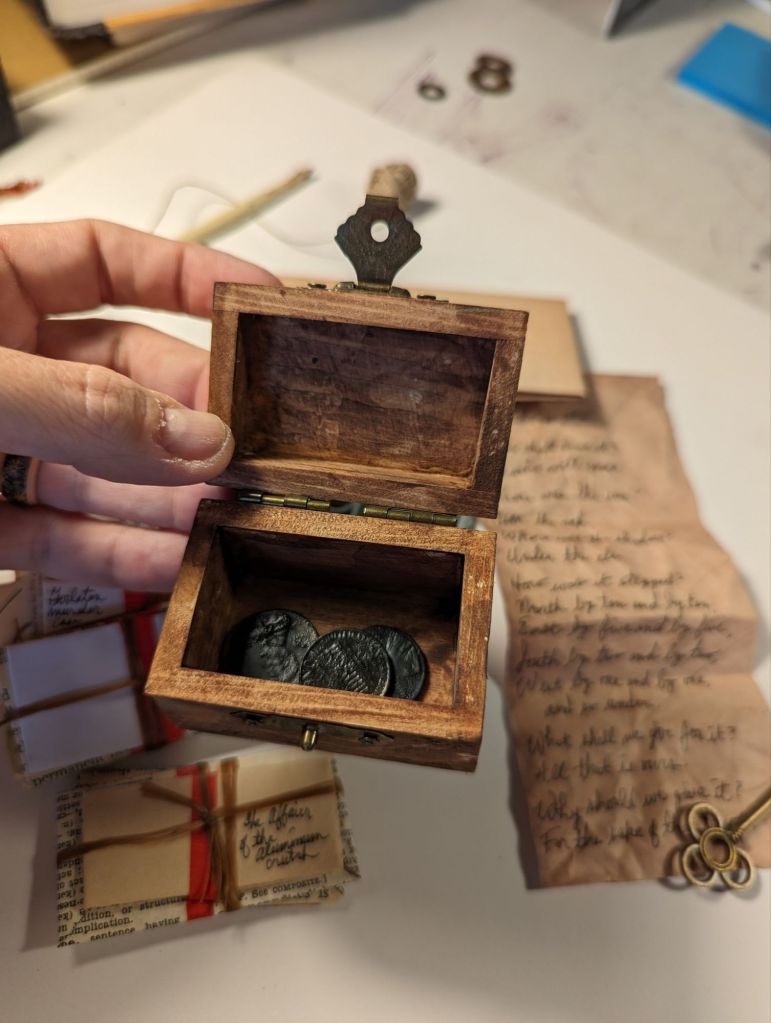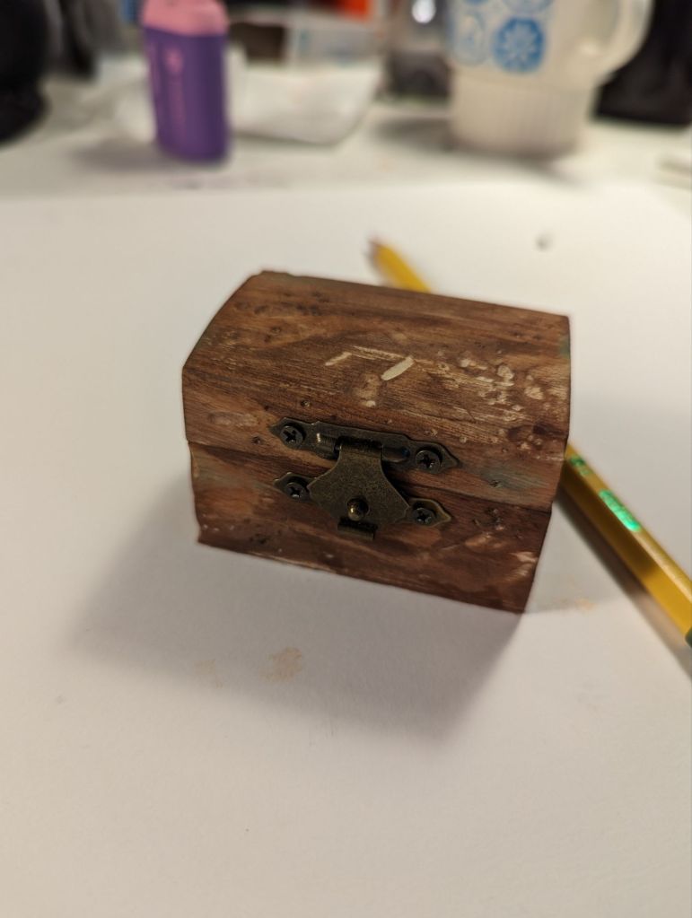An old worm-eaten wooden chest. I got to use the Dremel tool for this, which always makes me feel kinda badass and industrious.