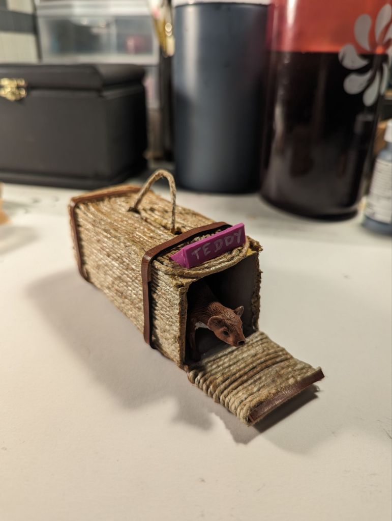 A wicker crate containing a mysterious furry animal named Teddy. -