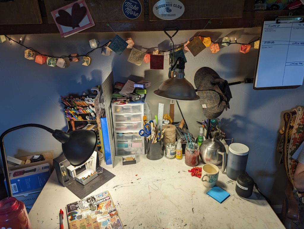 Here’s my hidey-hole, where all the magic happens. I’ve been making an effort to work a little neater lately, but this is about as good as it gets. If I do too much cleaning and organizing I can’t find anything, so I avoid it as much as possible. I came out of my last manic episode with that deerstalker hat hanging back there. Now, I’m not saying that I have to be manic to buy a Sherlock Holmes hat – definitely not; but I have to be manic to buy a fucking Harris tweed Sherlock Holmes hat. Go big or go home, amiright?! I briefly tried to hide it from my husband to avoid talking about how much money I spent, but my guilty conscience drove me to ‘fess up pretty quickly. Fortunately his reaction was “Jesus, babe, you’re such a fucking nerd…just don’t wear it when we’re out on a date.”