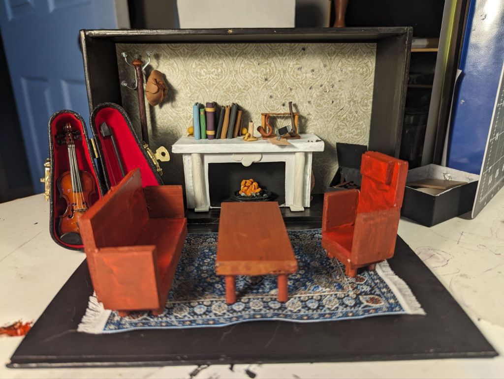 Made especially for my badass violin instructor. I basically made a Sherlock Holmes dollhouse, which was super fun. The fireplace and coat rack are glued in place, but everything else can be arranged and rearranged. There is a Persian slipper containing a miniscule packet of “tobacco” (loose leaf tea) hanging on the right side of the mantelpiece, there is a tiny letter stabbed into the top with a jack-knife, and the previous day’s leftover tobacco drying on the corner for Holmes’s pre-breakfast pipe (so gross). There is a coal scuttle containing coal and cigars in the corner, “V.R.” in bullet holes on the wall, and a deerstalker hanging on the coat rack. I didn’t make the rug or violin. The fireplace, coffee table, sofa, and chair are my first forays into making furniture. Also on top of the mantelpiece are a pipe stand with Holmes’s meerschaum pipe and the other pipe he smokes when he’s “disputatious,” a candle, and all of Holmes’s monographs.
